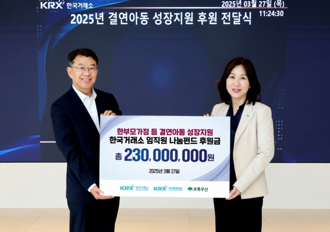 한국거래소는 한부모·조손가정 결연 아동을 지원하기 위한 후원금 2억3000만원을 초록우산 부산지역본부에 전달했다고 27일 밝혔다. 전달식은 이날 오전 11시30분에 부산에 위치한 본사에서 진행됐다. 정상호 KRX국민행복재단 사무국장과 이수경 초록우산 부산지역본부장 등 관계자가 참석했다. 해당 후원금은 한국거래소 임직원의 개인 기부금과 '(1만원미만)급여끝전 모으기'를 통해 모은 기금 4099만원으로 조성됐다. 한부모가정 등 아동 87명에게 학습비와 기초생계비로 매년 240만원(월 20만원)을 고등학교 졸업 시까지 지급될 예...