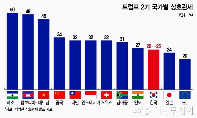 도널드 트럼프 미국 행정부가 한국에 부과하는 상호관세율을 25%로 수정, 확정했다. 백악관은 3일(현지시간) 홈페이지에 공개한 상호관세 행정명령 부속서에서 한국의 상호관세율을 전날 26%에서 25%로 수정했다. 트럼프 대통령이 전날 백악관 로즈가든에서 세계 각국의 상호관세율이 적힌 차트를 공개했을 때 한국의 상호관세율은 25%로 적혀 있었지만 이후 백악관이 홈페이지에 공개한 행정명령 부속서에 26%로 기재돼 혼선이 빚어졌다. 백악관은 트럼프 대통령이 공개한 차트의 상호관세율과 행정명령 부속서의 상호관세율이 다른 데 대해 전날 ...