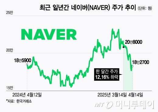 네이버 주가가 한 달간 12%대 하락했다. 특별한 호재도, 악재도 없었지만 기관과 외국인 투자자의 순매도가 주가 약세를 이끌었다. 증권가에서는 네이버의 주가수익비율(PER)이 낮은 수준으로 내려왔다며 장기 투자 관점에서 저가 매수의 기회가 왔다고 평한다. 14일 한국거래소에 따르면 코스피 시장에서 네이버(NAVER)는 전 거래일보다 300원(0.16%) 내린 18만2700원에 마감했다. 최근 한 달간 네이버 주가는 12.16% 하락, 코스피 하락률(4.30%)보다 두 배 넘게 내렸다. 한 달 동안 시가총액은 4조원 넘게 날아갔다....