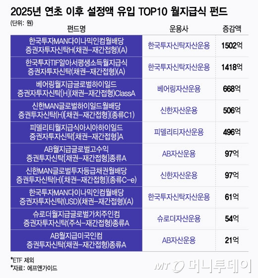 월배당 ETF(상장지수펀드) 성장세에 힘입어 월 지급식 일반 공모펀드 시장이 지난해 300% 이상 성장했다. 증시 불확실성이 커지면서 매달 꾸준히 현금을 얻을 수 있는 월 지급식 상품 전반으로 투자자 관심이 확산된 것으로 풀이된다. 수익이나 배당금을 기반으로 분배금이 바뀌는 ETF와 달리 일반 공모펀드는 월 지급액을 어느정도 예측할 수 있다는 장점이 있다. 16일 금융정보업체 에프앤가이드에 따르면 지난해 말 1조4865억원이던 월 지급식 공모펀드는 순자산액은 지난달 31일 기준 1조9026억원으로 확대됐다. 한 분기 만에 순자...