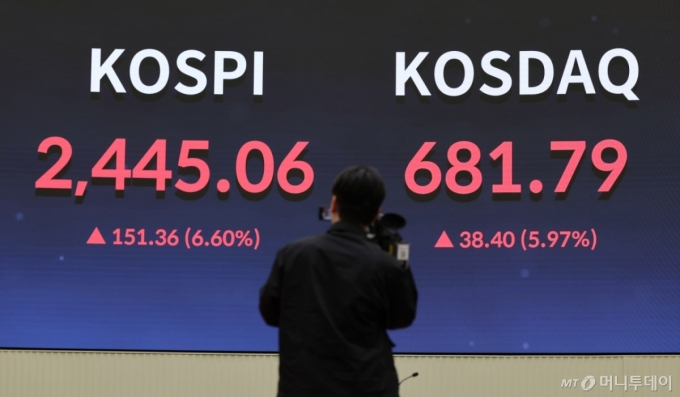간밤 도널드 트럼프 미국 대통령의 상호관세 90일 유예 발표로 뉴욕증시가 폭등하자 국내 증시에도 긍정적인 영향을 미쳤다. 10일 외국인 투자자가 10거래일만에 코스피 시장에서 순매수세로 전환하며 코스피가 2400선을 회복했다. 코스닥 시장에서는 총 1575개 종목이 상승하며 상승 종목 수로 역대 1위를 기록했다. 10일 한국거래소에 따르면 오후 3시33분 기준 코스피 지수가 전 거래일 대비 151.36포인트(6.60%) 오른 2445.06에 마감했다. 전날 2200선까지 미끄러진 후 하루만에 2400선 중반까지 반등했다. ...