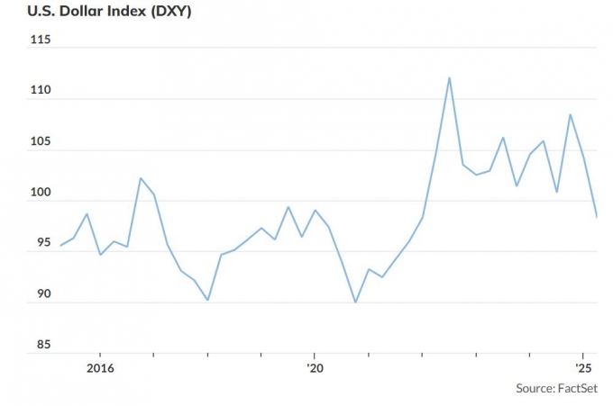 미국 달러가 21일(현지시간) 하락세를 지속하며 2022년 이후 3년 남짓만에 최저치로 떨어졌다. 도널드 트럼프 미국 대통령이 연일 제롬 파월 연방준비제도(연준) 의장을 압박하며 긴장감이 높아지자 글로벌 투자자들이 미국 자산을 팔고 있기 때문으로 보인다. 이날 주요 6개 통화 대비 달러 가치를 나타내는 ICE 미국 달러 인덱스는 한 때 97.92까지 떨어졌다. 팩트셋에 따르면 이는 2022년 3월 이후 최저치다. 이날 오후 달러 인덱스는 전 거래일 대비 1% 이상 하락한 98.38로 거래됐다. 트럼프 대통령은 지난주에 이어 ...