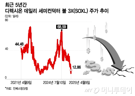 미국 주식에 레버리지로 투자한 개인이 안도의 한숨을 쉬었다. 최근 급락세를 보이던 미국 증시가 도널드 트럼프 대통령의 상호관세 유예 입장에 급등해서다. 한국인이 대거 사 모은 반도체 3배 레버리지 상품의 주가도 하루 만에 54% 급등했지만, 여전히 고점 회복까진 갈 길이 멀다. 9일(현지시간) 미국 뉴욕증권거래소에서 디렉시온 데일리 세미컨덕터 불 3X(SOXL)가 전일 대비 54.79% 오른 12.77달러에 마감했다. SOXL은 전날 9.84% 하락하면서 8.25달러에 거래를 마쳤는데, 이는 종가 기준으로 글로벌 증시가 하락세였던...