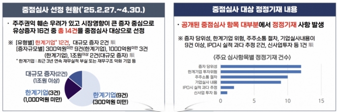 금융감독원이 올해 2월 유상증자 중점심사제도를 도입한 이후 유상증자 14건에 대해 중점심사를 진행했다. 금감원은 28일 '자본시장 혁신 추진 성과와 계획' 발표에서 지난 2월 유상증자 중점심사제도 도입 이후 지난달 말 기준 유상증자 총 16건 중 14건을 중점심사 대상으로 선정해 살펴봤다고 밝혔다. 그 결과 한계기업이 12건으로 대부분을 차지했다. 나머지 2건은 1조원 이상의 대규모 유상증자 사례였다. 정정사항으로는 증자 당위성(12건), 한계기업 투자위험(12건), 주주소통 절차(10건), 기업실사(9건) 등이 발생했다. 금감...