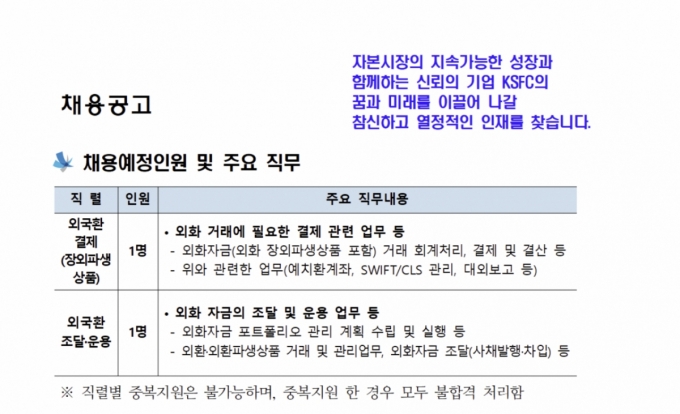 한국증권금융(사장 김정각)이 올해 상반기 경력사원 정규직 채용을 실시한다고 16일 밝혔다. 이번 경력사원 채용은 외국환 결제(장외파생상품) 직렬(1명 이내)과 외국환 조달·운용 직렬(1명 이내), 총 2개 직렬에서 2명 이내의 인원을 선발할 예정이다. 지원서 접수 기간은 이날부터 26일 오후 4시까지다. 자세한 사항은 한국증권금융 홈페이지 공지사항에서 확인할 수 있다. 합격자는 다음 달 4일 발표될 예정이다. ...