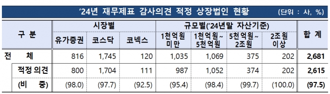 감사의견이 '적정'이라고 하더라도 '계속기업 불확실성'이라는 표현이 더해진 상장사 가운데 넷 중 한 곳은 이후 상장폐지 또는 비적정의견을 받은 것으로 조사됐다. 18일 금융감독원이 발표한 '2024 회계연도 상장법인 재무제표와 내부회계관리제도 감사의견 분석'에 따르면 재무제표 감사의견이 '적정'인 상장사는 분석 대상 2681개사 중 2615개사(97%)였다. 2019년 신외감법 시행 이후 큰 변동 없이 97% 수준을 유지했다. 적정의견 기업 중 감사인이 '계속기업 관련 중요한 불확실성'을 기재한 상장사는 84개사로 전기 대비 1...