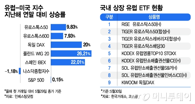 올해 유럽 증시가 이례적으로 높은 성과를 내며 미국 증시 수익률을 앞질렀다. 그러나 국내 증시에 상장된 유럽 관련 ETF(상장지수펀드)는 9개에 불과하다. 국내 투자자들의 해외 '분산 투자' 수단이 한정적이라는 지적이 제기된다. 31일 인베스팅닷컴에 따르면 지난 29일 종가 기준 유럽을 대표하는 유로스톡스50과 유로스톡스600 지수는 연초 대비 각각 9.8%, 7.9% 상승했다. 이는 미국 대표 지수인 나스닥종합(-1.2%)과 S&P500(0.2%)지수의 상승률을 크게 웃도는 수치다. 유로스톡스50은 유럽증시에 상장되...