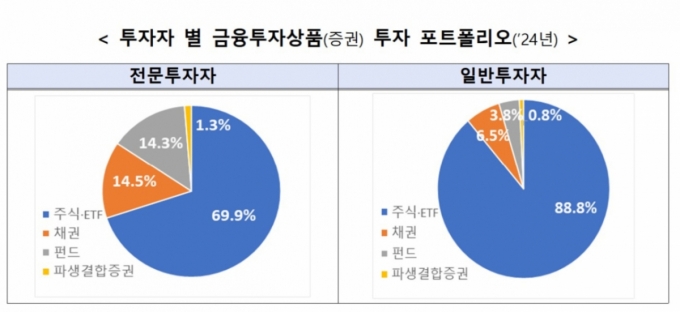 개인 전문투자자의 금융투자상품 투자 포트폴리오가 주식·ETF(상장지수펀드)에 집중된 일반투자자와 달리 분산투자 경향을 보인 것으로 나타났다. 22일 금융감독원이 공개한 '개인 전문투자자 현황 및 포트폴리오 주요 특징'을 살펴보면 지난해 말 전문투자자의 금융투자상품은 주식·ETF에 69.9%를, 채권에 14.5%를, 펀드에 14.3%를 나눠 투자했다. 일반투자자가 주식·ETF에 88.8%를 집중투자하고 채권(6.5%)과 펀드(3.8%)는 거의 담지 않은 것과 비교된다. 개인 전문투자자 1인당 평균 금융투자상품 투자금액은 6억20...