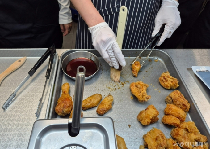 "가맹점주들이 로봇 덕분에 편하고 정확하게 일할 수 있다고 얘기합니다." 지난달 30일 경기 오산에 있는 교촌에프앤비의 교육·R&D(연구개발) 센터 '정구관' 2층 주방에선 성인 남성 키보다 큰 흰색 로봇 팔이 쉴새없이 움직이고 있는 장면이 눈길을 끌었다. 튀긴 닭을 담은 바구니를 상하좌우로 흔드는 성형작업이다. 로봇은 이를 수차례 반복한 뒤 닭을 재벌 튀김기로 옮겼다. 이날 교촌은 '교촌1991스쿨'을 열고 기업의 역사와 철학을 비롯해 브랜드를 대표하는 기법인 붓질과 지난해 도입한 조리 로봇이 핵심인 ...