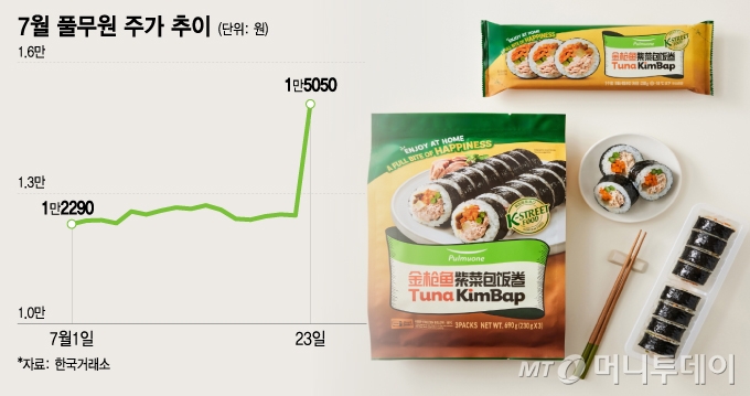 풀무원 중국 법인이 중국 현지에서 판매하는 냉동 김밥이 폭발적인 인기를 끌고 있다는 소식에 풀무원 주가가 급등했다. 증권가에서는 소비 경기 둔화로 풀무원의 2분기 실적이 부진할 것으로 본다. 하지만 중국 법인 매출은 냉동 김밥 등 판매 호조로 선방하겠다. 23일 한국거래소(KRX) 코스피 시장에서 풀무원은 전일 대비 2560원(20.50%) 오른 1만5050원에 거래를 마쳤다. 냉동 김밥을 주로 판매하는 냉동 식품 가공업체 우양 주가도 덩달아 올랐다. 이날 우양은 코스닥 시장에서 전일 대비 150원(4.66%) 오른 3370원...