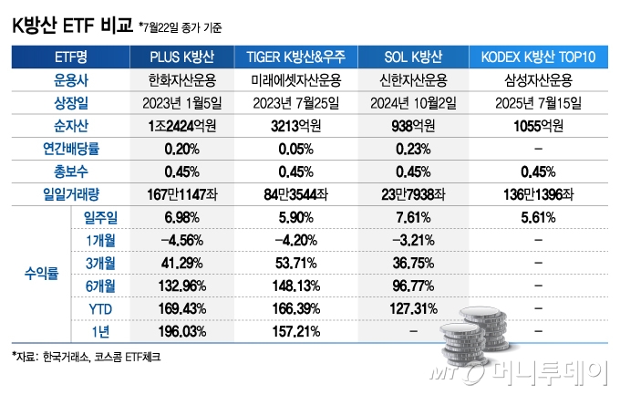 삼성자산운용이 KODEX K방산 TOP10 ETF(상장지수펀드)를 내놓으며, K방산 ETF 전쟁에 참전했다. 이로써 국내 상장된 K방산 ETF는 4개로 늘었다. 올해 상반기 급등했던 국내 방산주가 여전히 상승세를 이어가는 만큼 K방산 ETF 경쟁은 더욱 치열해질 것으로 보인다. ━KODEX ETF, K방산 ETF 전쟁 참전 ━23일 한국거래소(KRX)와 코스콤 ETF체크에 따르면 K방산 ETF는 PLUS K방산, TIGER K방산&우주, SOL K방산, KODEX K방산TOP10 등 4개다. 순자산이 가장 큰 상품은...