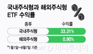 올해 들어 국내 주식시장이 상승세를 타고 있는 가운데 ETF(상장지수펀드)도 국내주식형과 해외주식형의 수익률이 엇갈렸다. 지난해와 정반대의 결과라는 점에서 주목된다. 8일 금융투자업계와 에프앤가이드에 따르면 국내주식형 ETF펀드의 올 한해 수익률(1월1일~8월7일)은 33.31%로 집계됐다. 구체적으로 지난 7일 기준으로 6개월간 수익률은 24.61%, 3개월간 수익률은 24.61%였다. 지난해와 비교하면 수익률 반등을 이뤄냈다는 의견이다. 2024년 한해동안의 국내주식형 ETF 수익률은 -(마이너스)13.83%였다. 특히 2...
