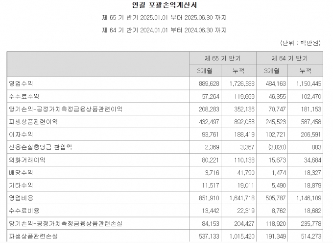 한화투자증권이 2분기 자산관리(WM) 및 자산운용(Trading) 부문 실적을 끌어올리며 흑자전환에 성공했다. 한화투자증권은 13일 2025년도 2분기 연결기준 당기순이익이 293억2000억원, 영업이익은 337억2000억원이라고 밝혔다. 지난해 2분기 당기순손실은 193억원, 영업손실은 216억원이었다. 영업수익도 4842억원에서 8896억원으로 두 배 가까이 늘었다. 2025년도 상반기 기준 당기순이익은 664억8000억원, 영업이익은 848억7000억원, 영업수익은 1조7266억원이다. NCR(순자본비율)은 지난해 말...