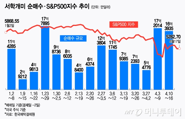 서학개미들이 관세 충격에 급락한 미국 증시에서 역대급 순매수를 이어가고 있다. 미국 증시의 장기 상승세를 믿고 쌀 때 사두자는 심리가 강한 것으로 보인다. 서학개미들의 순매수는 반도체주 및 나스닥100지수에 대한 3배 레버리지 ETF(상장지수펀드), 장기 국채 ETF, 테슬라와 엔비디아, 애플 등으로 집중됐다. 반면 순매도를 나타낸 종목은 거의 없었고 순매도 규모도 미미했다. 한국예탁결제원에 따르면 서학개미들은 지난 10~16일(결제일 기준 14~18일) 사이에 미국 증시에서 16억3935만달러를 순매수했다. 이는 머니투데...