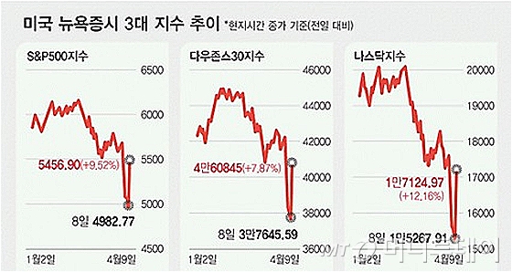 도널드 트럼프 미국 대통령이 9일(현지시간) 상호관세 90일 유예를 발표하면서 전 세계 증시가 역사적인 상승세를 기록했다. 지난 2일 상호관세 발표 이후 연일 고꾸라지던 미국 뉴욕증시를 비롯해 유럽과 아시아 주식시장도 기록적인 매수세로 전환됐다. 이날 뉴욕증권거래소에서 기술주 중심의 나스닥종합지수는 전 거래일보다 12.16% 치솟은 1만7124.97에 마감했다. 2001년 1월 이후 하루 기준 최대 상승폭이자 역대 두 번째 상승 기록이다. S&P500 지수도 9.52% 급등한 5456.90으로 2008년 금융위기 이후 ...