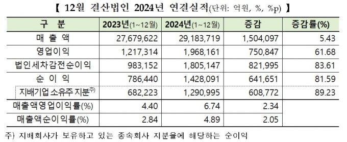 지난해 국내 코스피 상장사들의 매출액이 소폭 늘어난 것으로 나타났다. 영업이익과 순이익은 2023년 대비 대폭 늘었다. 고금리와 국내외 정치적 리스크, 지정학적 불확실성으로 국내 기업들이 어려운 시간을 보냈지만 기저효과가 이를 상쇄했다. 2일 한국거래소에 따르면 12월 결산 코스피 상장사 703개사 중 금융사와 감사의견 비적정, 사업보고서 제출 기한을 연장한 기업 등을 제외한 614개사의 연결 재무제표 기준 지난해 영업이익은 196조8161억원으로 2023년 대비 61.68% 증가했다. 순이익은 142조8091억원으로 같은기간...